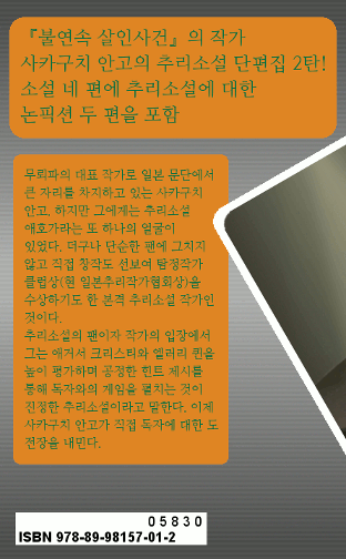이미 출간된 『선거 살인사건』, 그리고 공동 단편집인 『그림자 없는 범인』에 수록된 단편 「그림자 없는 범인」을 합치면 사카구치 안고가 쓴 모든 추리 단편(연작을 제외한 개별 작품)이 전부 우리나라에 나온 셈이다. 명성에 비하면 늦은 감이 있고 비록 전자책이라는 형식이긴 하지만 이렇게라도 소개하게 되어 다행이 아닐까. 처음이자 마지막일지도 모를 이 기회를 부디 놓치지 마시길.
