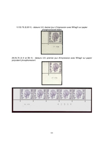 12.03.76 (6,50 fr) - dateurs 3-6: dernier jour d’impression avec Wifag2 sur papier phosphorescent blanc 28.05.76 (5 fr et B5 fr) - dateurs 3-6: premier jour d’impression avec Wifag2 sur papier polyvalent phosphorescent 101