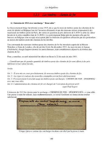 L'émission de 1912 fut choisie pour la surcharge « CHEMINS DE FER – SPOORWEGEN » + roue ailée.