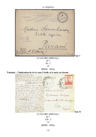 Les Belgolâtres Type 3c LE HAVRE (SPECIAL) 18 * 50 –2 16 SEINE · INFre Variante : l’indication de levée sans l’étoile et le mois est absent Type 3d LE HAVRE (SPECIAL) 16 * 120 –2 14 SEINE · INFre 116