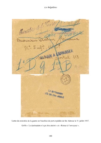 Les Belgolâtres Lettre du ministère de la guerre en franchise de port expédiée de Ste Adresse le 11 juillet 1917. Griffe « Le destinataire n’a pu être atteint » et « Retour à l’envoyeur ». 160