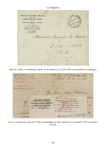 Les Belgolâtres Lettre de l’Office Central Belge expédié de Ste Adresse le 22 août 1918 vers un militaire en campagne. Lettre et courrier du comité de l’Office Central Belge de Paris expédiée le 6 novembre 1918 en franchise de port. 182