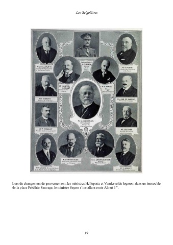 Les Belgolâtres Lors du changement de gouvernement, les ministres Helleputte et Vandervelde logeront dans un immeuble er de la place Frédéric Sauvage, le ministre Segers s’installera route Albert 1 . 19