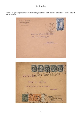 Les Belgolâtres Flamme de type Daguin du type : G du mot Belge de forme ronde mais les lettres du « 4 Août » ont 2,75 mm de hauteur. 205
