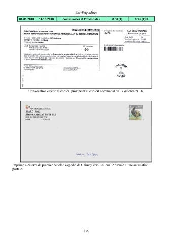 Imprimé électoral de premier échelon expédié de Chimay vers Baileux. Absence d’une annulation