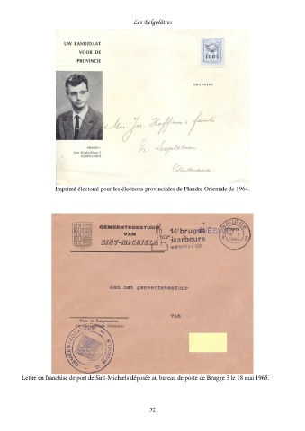 Les Belgolâtres Imprimé électoral pour les élections provinciales de Flandre Orientale de 1964. Lettre en franchise de port de Sint-Michiels déposée au bureau de poste de Brugge 3 le 18 mai 1965. 52