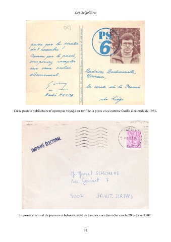 Les Belgolâtres Carte postale publicitaire n’ayant pas voyagé au tarif de la poste et ce comme feuille électorale de 1981. Imprimé électoral du premier échelon expédié de Jambes vers Saint-Servais le 29 octobre 1981. 78