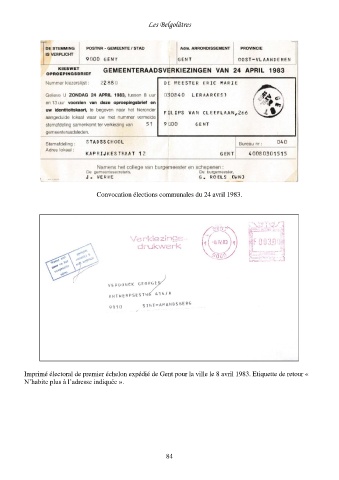 Les Belgolâtres Convocation élections communales du 24 avril 1983. Imprimé électoral de premier échelon expédié de Gent pour la ville le 8 avril 1983. Etiquette de retour « N’habite plus à l’adresse indiquée ». 84