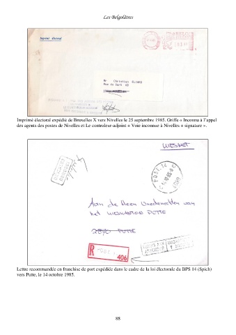 Imprimé électoral expédié de Bruxelles X vers Nivelles le 25 septembre 1985. Griffe « Inconnu à l’appel