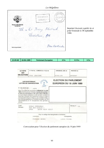 Les Belgolâtres Imprimé électoral expédié de et pour Oostende le 30 septembre 1988. 15-04-82 18-06-1989 Parlement Européen 3 frs 4.5 frs 6 frs Convocation pour l’élection du parlement européen du 18 juin 1989 95