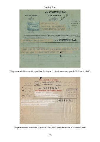 Les Belgolâtres Télégramme via Commercial expédié de Torrington (U.S.A.) vers Antwerpen, le 21 décembre 1945. er Télégramme via Commercial expédié de Lima (Pérou) vers Bruxelles, le 1 octobre 1950. 192
