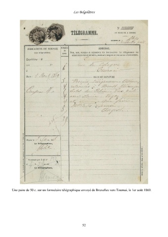 Les Belgolâtres Une paire de 50 c. sur un formulaire télégraphique envoyé de Bruxelles vers Tournai, le 1er août 1869. 52