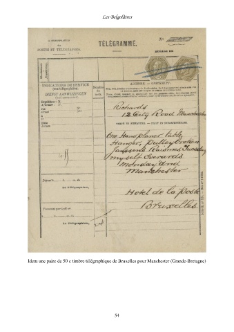 Les Belgolâtres Idem une paire de 50 c timbre télégraphique de Bruxelles pour Manchester (Grande-Bretagne) 54