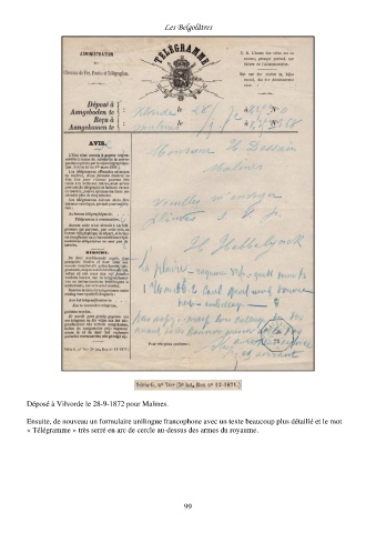 Les Belgolâtres Déposé à Vilvorde le 28-9-1872 pour Malines. Ensuite, de nouveau un formulaire unilingue francophone avec un texte beaucoup plus détaillé et le mot « Télégramme » très serré en arc de cercle au-dessus des armes du royaume. 99