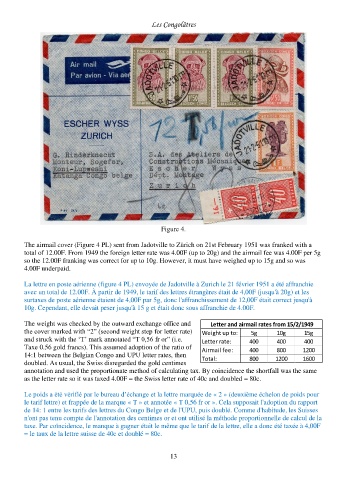 La lettre en poste aérienne (figure 4 PL) envoyée de Jadotville à Zurich le 21 février 1951 a été affranchie