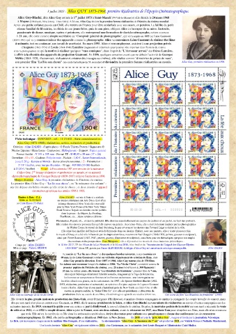 Mise en page : Valérie BESSER 1818-2018" (deux TP, gravés par Pierre ALBUISSON). L'effigie d'Alice Guy est une réussite artistique remarquable. Aline ZALKO