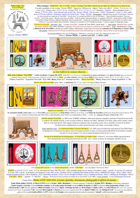 Timbre à Date - P.J. : Fiche technique : 05/06/2023 - réf. 11 23 485 - Carnet : Iconique Tour Eiffel, illustré par des objets de collection sur la dame de fer.