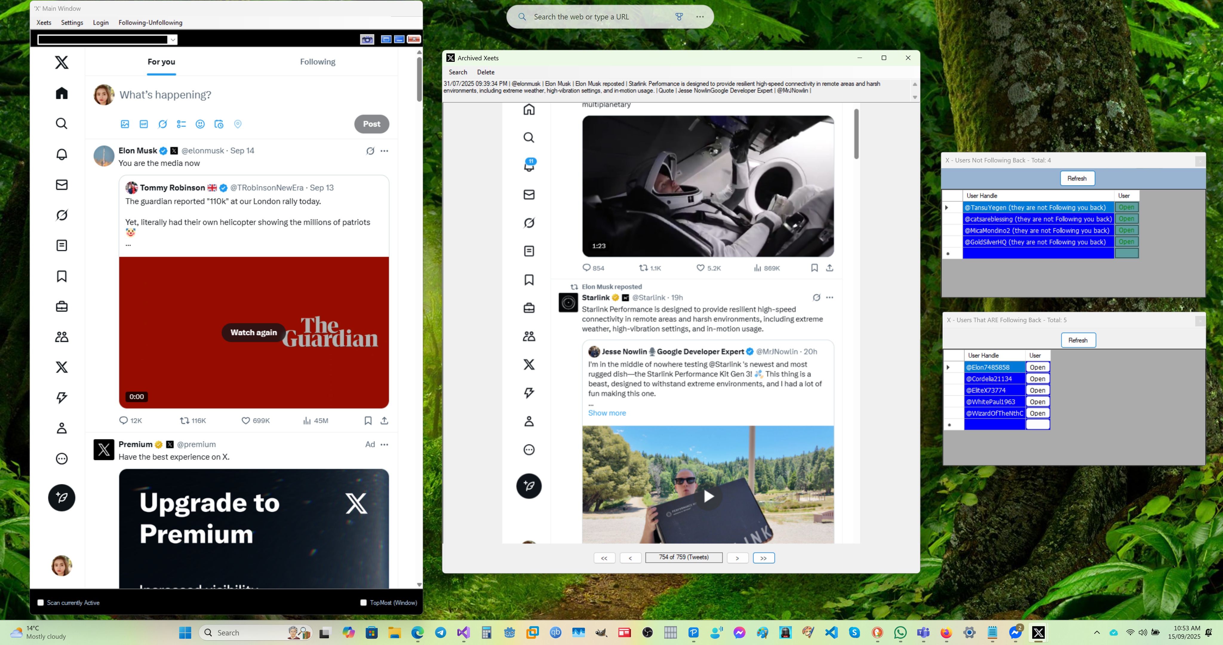 Introducing 'X' Elite (formerly known as Twitter) the app! - A new feature-rich Windows Desktop application, with new powerful built-in features that add to, and enhance X!. Scanning of Tweets (we call them 'Xeets' now in line with the platform name change) when someone in your List (defined in settings) Posts something, a new window is opened to display it, automatically scrolling to the new Xeet, the new Xeet can also be narrated (option in Settings) also includes a 'no-nonsense simple custom list of userhandles that are not following you back', new Xeets that are shown, are automatically saved and archived. Archive system can be searched and navigated! When a new Xeet/Tweet is displayed, it is automatically saved to the archive system. The archive system displays them in a database-like file system, that can be navigated using back and forward buttons, the archive system also has a Search system to find and display Xeets/Tweets matching the search criteria. New Xeets/Tweets automatically shown in new Windows Followed and tracked Xeets/Tweets are automatically saved into an archive. The archive can then be easily be acccessed from the main window menu, (as shown in the video below). It is fully searchable, as demonstrated. Fully searchable archive display system Easily display lists of people that are not Following you back, and also, those that are following back (both options easily selected from the main window menu system). Demonstation shows the easy process below, including opening the profile page of someone not following you, unfollowing them, then closing the profile window and then observing the updated list with their handle automatically removed. 'X' Elite supports multiple logon's, that are then easy to drag-and-drop, as shown below in the video: Once downloaded and un-zipped, please read the 'ReadMe' text file, first. 'X' Elite easily starts in Windows, by double-clicking the 'X - Launcher.exe' inside its folder (no installation necessary - simple and easy). Note: If you move the folder to a different location, just 'double click' the 'X - Launcher.exe' again, to update the desktop shortcut, and run the app. Allow your Antivirus software to scan and check the app, this is normal the first time you run the application, as the software is new, some antivirus software may wrongly false-flag it as a virus, we can assure you that our software if fully scanned and checked as completely virus free, and contains nothing malicious, and contains no advertising! | ||