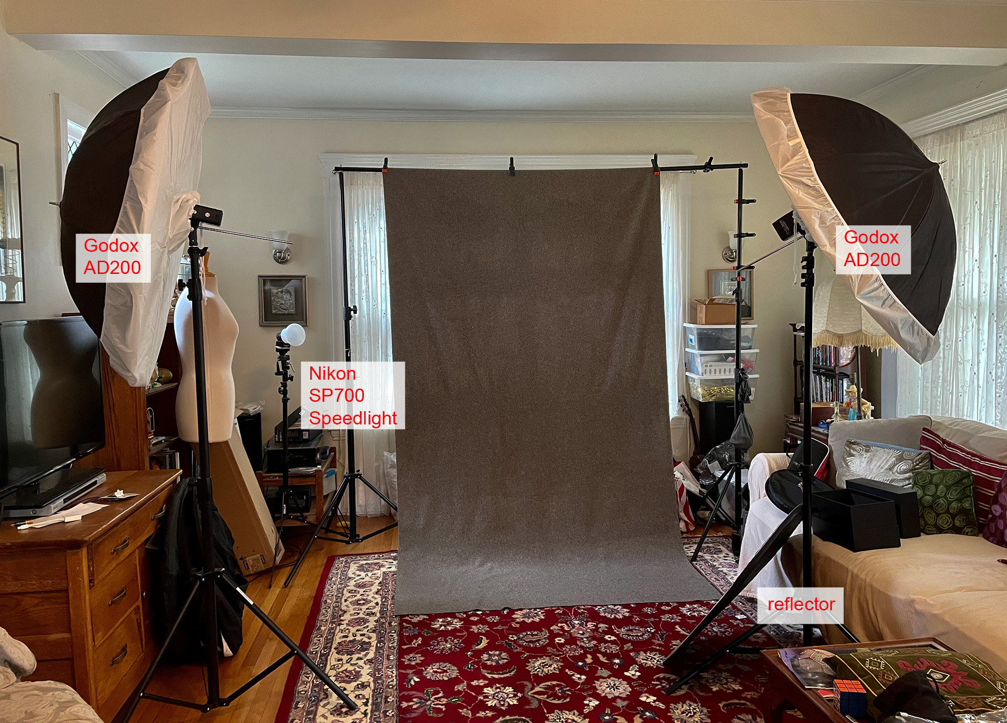 Here you can see a standard 3 light arrangement. Two lights (Godox AD200) in front to the left and right of where the model will stand. The two lights are modified with umbrellas that have a translucent material attached. These are "poor man's" softboxes that will produce a failry even, soft light.
